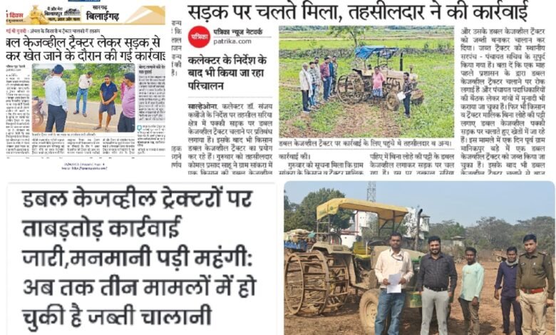 सारंगढ़-बिलाईगढ़। जिला कलेक्टर डॉ. संजय कन्नौजे के निर्देश पर प्रशासन ने सड़कों की सुरक्षा और सार्वजनिक संपत्ति की रक्षा हेतु डबल कैज व्हील युक्त ट्रैक्टरों पर कड़ी निगरानी शुरू की है। कलेक्टर के आदेशानुसार कोमल साहू तहसीलदार सरिया तहसील क्षेत्र के ग्राम मानिकपुर, बोन्दा, सांकरा एवं सरिया में ऐसे ट्रैक्टर चलाने वाले वाहन मालिकों के विरुद्ध जब्ती और चालानी कार्रवाई की जा चुकी है।