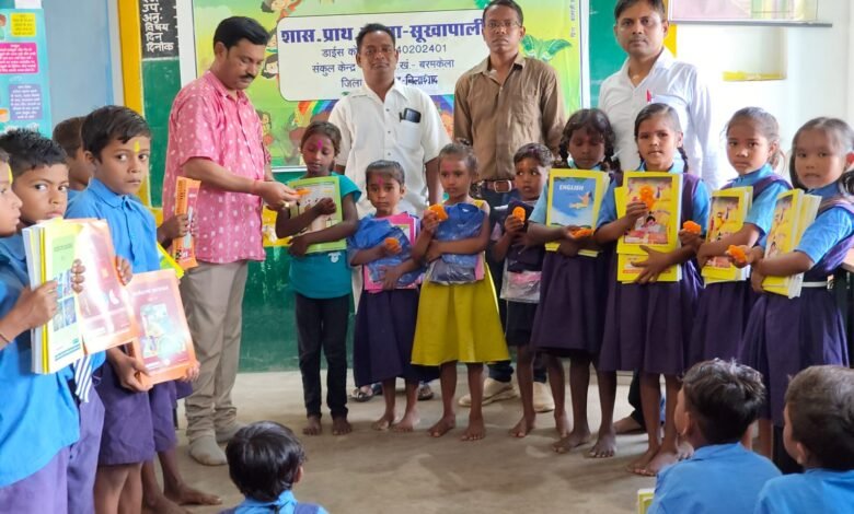 बरमकेला/राष्ट्रीय शिक्षा नीति में शाला प्रवेश उत्सव हेतु शासन से निर्देशित किया गया है ।इसी क्रम में शासकीय प्राथमिक शाला सुखापाली में विद्यालय खुलने के प्रथम दिवस पर ही नव प्रवेशी बच्चों और सभी कक्षाओं के बच्चों को तिलक लगाकर, शासन से प्राप्त निःशुल्क पाठ्य पुस्तकें और निशुल्क गणवेश देकर जलेबी से मुंह मीठा करा कर शाला प्रवेश उत्सव मनाया गया । इस अवसर पर शाला के सक्रिय सदस्य लोकनाथ नायक के द्वारा बच्चों को विद्यालय में नियमित अध्ययन करने,और उपस्थिती बनाए रखने हेतु बच्चों को प्रेरित किया गया। इस अवसर पर प्राथमिक शाला के प्रधान पाठक विनोद कुमार पटेल ने बच्चों को स्टेशनरी सामग्री जैसे स्लेट ,पेंसिल ,रबर पेन , पहाड़ा ,कलर और अभ्यास पुस्तिकाएं निःशुल्क प्रदान करने का विश्वास दिलाया और नियमित विद्यालय आने और मध्याह्न भोजन और विद्या अध्ययन का लाभ प्राप्त करने हेतु प्रेरित किया गया ।उक्त अवसर सहायक शिक्षक धरणीधर सिदार और विकास कुमार भगत उपस्थित थे।