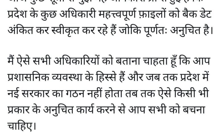 “आज कुछ सूत्रों से मुझे यह जानकारी प्राप्त हुई है कि प्रदेश के कुछ अधिकारी महत्त्वपूर्ण फ़ाइलों को बैक डेट अंकित कर स्वीकृत कर रहे हैं जोकि पूर्णतः अनुचित है।