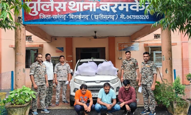 सारंगढ़ बिलाईगढ़ के पुलिस अधीक्षक पुष्कर शर्मा के द्वारा जिले के सभी थाना /चौकी प्रभारियों को जुआ सट्टा अवैध शराब गांजा मे संलिप्त व्यक्तियों को कड़ी से कड़ी कार्यवाही करने हेतु निर्देशित करते आ रहे हैं अतिरिक्त पुलिस अधीक्षक कमलेश्वर चंदेल पुलिस अनुविभागीय अधिकारी अविनाश मिश्रा के कुशल मार्गदर्शन पर दिनांक 27/07/24 थाना प्रभारी बरमकेला सउनि विजय गोपाल के साथ हमराह आर.. दिनेश चौहान मिनकेतन पटेल बिहारी साहू महादेव बंजारा के साथ डोंगीपानी बैरियर मे वाहन चेकिंग के दौरान उड़ीसा बरमकेला मार्ग होते हुये सारंगढ़ की ओर हुये एक सफेद कलर एक्को स्पोर्ट्स कार मे सवार व्यक्ति पुलिस को देख कर गाडी को छोड़ कर भागने लगे जिसे दौड़ा कर पकडे नाम पता पूछने पर 1 चालक राकेश कुमार पेनिका पिता भागीरथमल पेनिका उम्र 29 वर्ष निवासी रिणु तहसील लक्ष्मणगढ़ थाना बेलरा जिला सीकर राजस्थान 2- ओम प्रकाश रेप्सवाल पिता तिलोकराम रेप्सवाल उम्र 36 वर्ष निवासी शिवाजी का मंदिर ग्राम पोस्ट सेसम तहसील दातारामगढ़ थाना लोसल जिला सीकर राजस्थान 3- फूलचंद रावत पिता छितरमल रावत उम्र 36 वर्ष निवासी हनुमान जी का टीबामैड तहसील व थाना विराटनगर जिला जयपुर राजस्थान का रहने वाला बतऐ तथा उक़्त वाहन को तलाशी लेने पर वाहन मे 30 पैकेट मे 50 किलो अवैध मादक प्रदार्थ गांजा को बिक्री करने के लिए उड़ीसा के फूलबाड़ी से खरीद कर बिक्री करने हेतु जयपुर राजस्थान लेजाना बताने पर उक़्त तीनो आरोपी राकेश कुमार पेनिका ओमप्रकाश रेप्सवाल व फूलचंद रावत के विरुद्ध धारा 20 B NDPS ACT के तहत गवाहों के समक्ष विधिवत कार्यवाही कर आरोपियों के कब्जे से 50 किलो अवैध मादक प्रदार्थ गांजा कीमती 500000/ रु तथा एक सफेद रंग का एक्को स्पोर्ट्स कार क्रमांक RJ14CY5881 कीमती 300000 रु तथा घटना मे प्रयुक्त 3 नग मोबाइल,कीमती 26000रु कुल कीमत 8.26000 को जप्त कर उक़्त आरोपियों को आज दिनांक 27/07/24 को गिरफ्तार कर न्यायिक रिमांड पर भेजा गया है