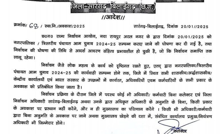 जिला निर्वाचन अधिकारी धर्मेश कुमार साहू ने सभी अवकाश पर लगाया प्रतिबंध