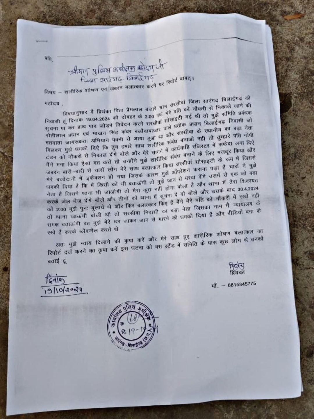 पिडित महिला ने एसपी सारंगढ़ को 19 अक्टूबर को किया था शिकायत,