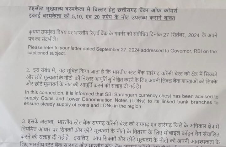बरमकेला। छोटे एवं बड़े ब्यापारियों और आम जनता को लेनदेन करने के लिए 5,10,20 एवं 50 रूपये के चिल्लहर सिक्के एवं नोट की कमी को देखते हुए छ्त्तीसगढ चेम्बर ऑफ़ कामर्स इकाई बरमकेला के अध्यक्ष रतन शर्मा द्वारा लगातार प्रयास किया जा रहा है और उस सम्बन्ध में भारतीय स्टेट बैंक शाखा रायगढ़ एवं सारंगढ़ से पत्र ब्यवहार एवं प्रत्यक्ष जाकर सम्पर्क किया गया बावजूद इसके चिल्लहर सिक्के एवं नोट नहीं उपलब्ध कराया। गया।जिसके के लिए चेम्बर ऑफ़ कामर्स के अध्यक्ष रतन शर्मा ने सीधे बैंकों के कंट्रोलर भारतीय रिजर्व बैंक को पत्र लिखकर वस्तुस्थिति से अवगत कराया गया था।इस पत्र को गम्भीरता से लेते हुए रिजर्व बैंक के सहायक महाप्रबंधक राजेन्द्रकुमार बंसोड़ ने चेम्बर अध्यक्ष रतन शर्मा को 8 नवम्बर 2024 को पत्र के माध्यम से अवगत कराया है कि चिल्लहर की समस्या को दूर करने भारतीय स्टेट बैंक शाखा सारंगढ़ एवं रायगढ़ को अवगत कराते हुए चिल्लहर की उपलब्धता सुनिश्चित करने की सलाह दी गयी है।यदि उपरोक्त बैंकों द्वारा अनदेखा किया जाता है तो सीधे फोन करने कहा गया है।