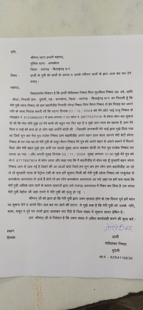 शिकायत में गौरीशंकर ने बताया कि 21 दिसंबर 2024 को उनकी बहू ने फोन करके बताया कि उसके पति और ससुराल वाले उसे बहुत मारते हैं। अगले दिन 22 दिसंबर को उन्हें पता चला कि श्वेता को जला दिया गया है और उसे अस्पताल ले जाया गया है। अस्पताल में इलाज के दौरान उसकी मौत हो गई।