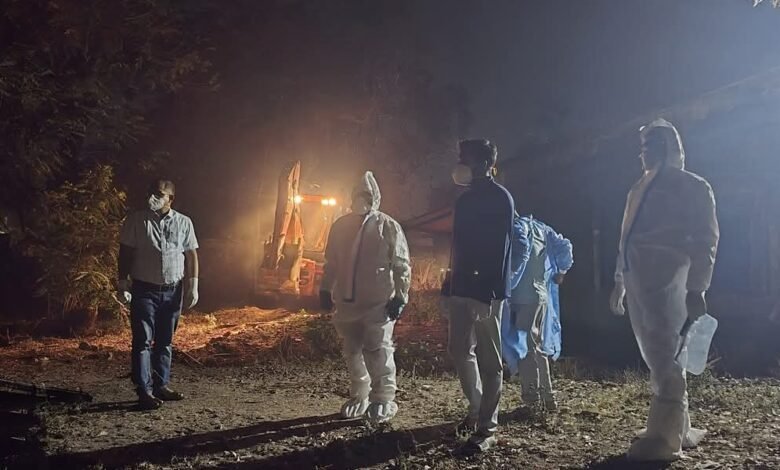 नगर निगम, पशु चिकित्सा विभाग और स्वास्थ्य विभाग की टीम ने पूरी रात संयुक्त अभियान चलाकर संक्रामक रोग प्रोटोकॉल के तहत पोल्ट्री फार्म की सभी मुर्गी, चूज़े, अंडे और कुक्कुट आहार को नष्ट किया। इसके लिए मुर्गों और चूजों को मारकर जमीन में दफनाया गया। इसके लिए पोल्ट्री फार्म परिसर में पूरे सुरक्षात्मक उपायों के साथ जेसीबी से गड्ढा खोदकर उसमें नमक और चुने की लेयर बिछा कर मुर्गियों और चूजों को दफनाया गया और ऊपर से फिर नमक और चुने की लेयर डाली गई। इसी प्रकार अंडों को भी नष्ट किया गया। जिससे संक्रमण न फैले। इसके साथ ही परिसर को संक्रमण मुक्त करने डिसइनफेक्शन किया जा रहा है। कलेक्टर श्री कार्तिकेया गोयल पूरी रात इस कार्रवाई का अपडेट लेते रहे।