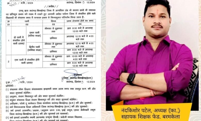 सारंगढ़: बढ़ती ठंड को देखते हुए सारंगढ़ बिलाईगढ़ जिले के कलेक्टर धर्मेश साहू ने एक महत्वपूर्ण निर्णय लिया है। जिले के सभी स्कूलों का समय अब बदला जाएगा। यह फैसला शिक्षक संगठनों के लगातार आग्रह के बाद लिया गया है।