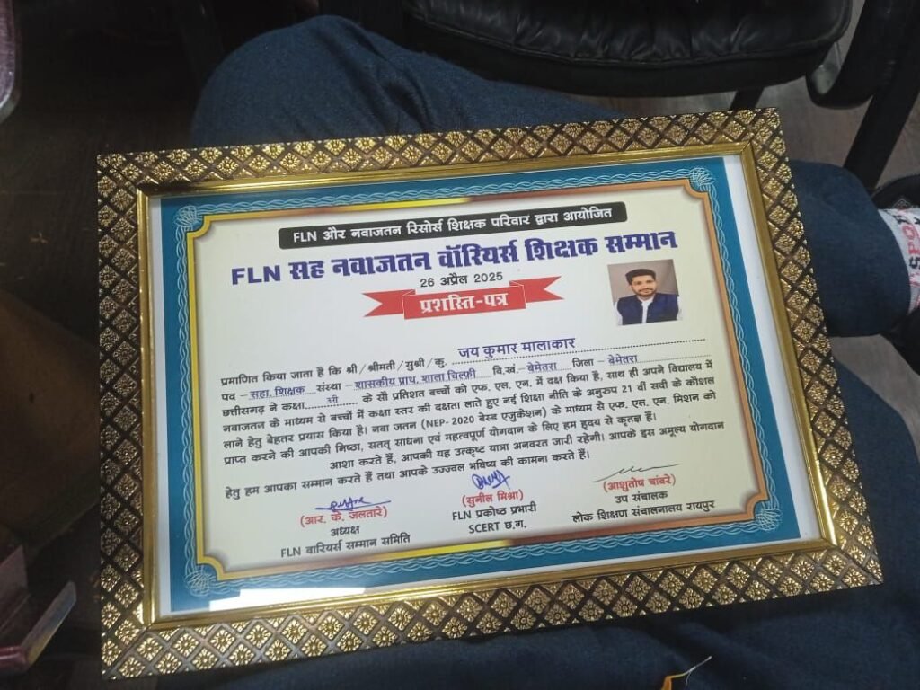 रायपुर/FLlN और नवाजतन रिसोर्स शिक्षक परिवार छत्तीसगढ़ के तत्वाधान में कक्षा 1 से 8 तक के बच्चों को भाषा और गणित में 100% दक्ष करने, साथ ही नवाजतन के माध्यम से बच्चों में कक्षा स्तर की दक्षता लाते हुए नई शिक्षा नीति के अनुरूप 21 वीं सदी के कौशल लाने हेतु प्रयास करने के लिए डॉ. योगेश शिवहरे अतिरिक्त संचालक लोकशिक्षण संचालनालय रायपुर, श्री आशुतोष चावरे उप संचालक लोकशिक्षण संचालनालय रायपुर, श्री सुनील मिश्रा FLN प्रकोष्ठ प्रभारी SCERT रायपुर , जिला शिक्षा अधिकारी रायपुर , जिला शिक्षा अधिकारी बेमेतरा, डाइट प्राचार्य रायपुर, डाइट प्राचार्य बेमेतरा एवं विकासखंड शिक्षा अधिकारी बेमेतरा की गरिमामयी उपस्थिति में राज्य स्तरीय सम्मान शासकीय प्राथमिक शाला चिल्फी बेमेतरा मे पदस्थ शिक्षक जय कुमार मालाकार को प्राप्त हुआ। यह पुरस्कार छ ग के 35000 विद्यालयों से विभिन्न माध्यमो से, कई चरणों मे चयनित होने के उपरांत टॉप 100 विद्यालयों को प्रदान किया गया। यह सम्मान समारोह आँजनेय यूनिवर्सिटी रायपुर मे आयोजित कई गयी जिसमे छ ग के 33 जिले के रिसोर्स पर्सन और चयनित शिक्षक साथी उपस्थित हुए। शिक्षक जय मालाकार का कहना हैकि इस तरह के आयोजन निश्चित ही शिक्षक साथियों को और अधिक ऊर्जा और निष्ठा से कार्य करने के लिए प्रेरित करता है, साथ ही उन्होंने कहा यह पुरस्कार मेरे माता – पिता और गुरुजनो के आशीर्वाद का प्रतिफल है मै यह सम्मान मेरे बच्चों के अथक मेहनत और लगन को समर्पित करता हूँ।