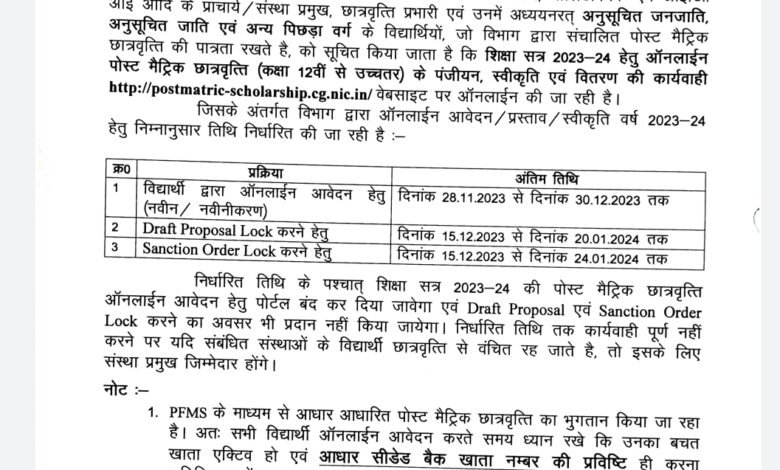 सारंगढ़ बिलाईगढ़/ अनुसूचित जाति, जनजाति एवं अन्य पिछड़ा वर्ग (एसटी, एससी और ओबीसी) विद्यार्थी जो छत्तीसगढ़ राज्य में संचालित शासकीय, अशासकीय विश्वविद्यालय, महाविद्यालय, इंजीनियरिंग, मेडिकल, नर्सिंग कॉलेज , पॉलिटेक्निक, आईटीआई आदि में अध्यनरत हो वे 30 दिसंबर 2023 तक पोस्ट मैट्रिक छात्रवृत्ति के लिए वेबसाइट postmatric-scholarship.cg.nic.in (पोस्ट मैट्रिक स्कॉलरशिप डॉट सीजी डॉट एनआईसी डॉट इन) में ऑनलाइन आवेदन आवेदन कर सकते हैं। निर्धारित तिथि के बाद शिक्षा सत्र 2023-24 के लिए पोस्ट मैट्रिक छात्रवृत्ति ऑनलाइन आवेदन हेतु पोर्टल बंद कर दिया जाएगा। इसके साथ-साथ ड्राफ्ट प्रपोजल लॉक 20 जनवरी 2024 तक और सैंक्शन ऑर्डर लॉक 24 जनवरी 2024 तक करना निर्धारित है। अंतिम तिथि तक कार्रवाई पूर्ण नहीं करने पर संबंधित संस्थाओं के विद्यार्थी छात्रवृत्ति से वंचित रह जाते हैं तो इसके लिए संस्था प्रमुख जिम्मेदार होंगे। पीएफएमएस के माध्यम पर आधारित पोस्ट मैट्रिक छात्रवृत्ति का भुगतान किया जा रहा है । सभी विद्यार्थी ऑनलाइन आवेदन करते समय ध्यान रखें कि उनका बचत खाता एक्टिव हो और आधार नंबर स्टेट बैंक खाता नंबर में एंट्री (प्रविष्टि) होना चाहिए। वित्तीय वर्ष 2023- 24 से विद्यार्थियों द्वारा पोस्ट मैट्रिक छात्रवृतियां किए गए आवेदन का सत्यापन आधार से लिंक मोबाइल नंबर पर ओटीपी के माध्यम से किया जाना है।विद्यार्थी आधार नंबर पर पंजीकृत मोबाइल नंबर की प्रविष्टि आवेदन करते समय करें।