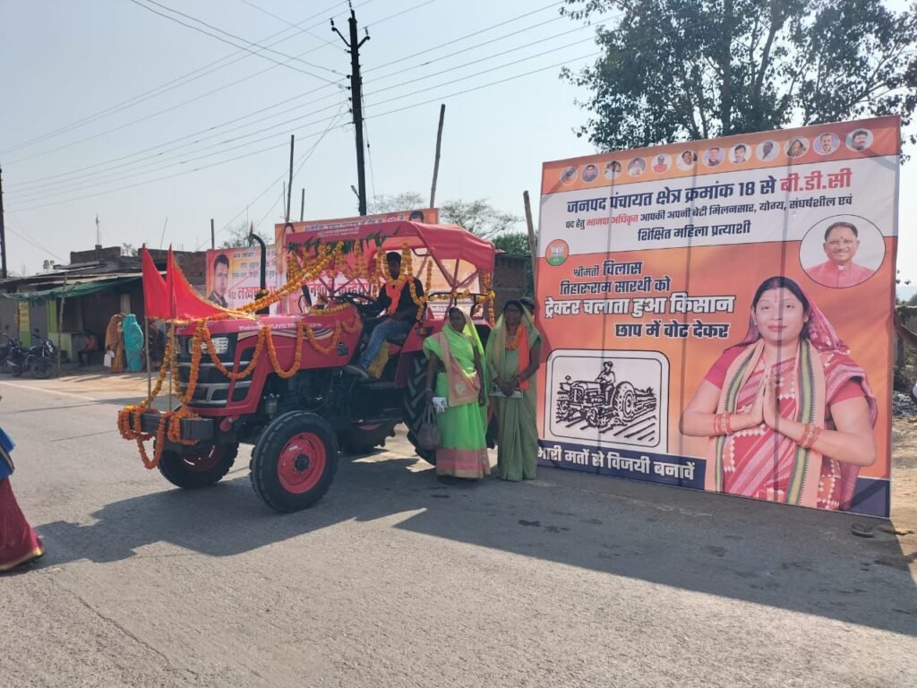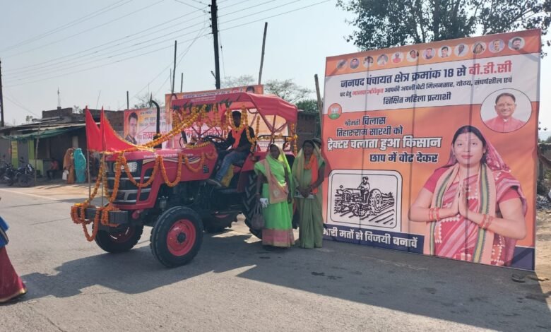 सारंगढ़ /जनपद पंचायत क्षेत्र क्रमांक 18 में श्रीमती विलास तिहारुराम सारथी को चुनाव चिन्ह ट्रैक्टर छाप मिला है। अपने प्रचार को अनूठा बनाने के लिए उन्होंने ट्रैक्टर को आकर्षक तरीके से सजाया और इसे ही अपना प्रचार वाहन बना लिया। ग्रह ग्राम घूमकर मतदाताओं से समर्थन मांग रही हैं और जनता से आशीर्वाद ले रही हैं।