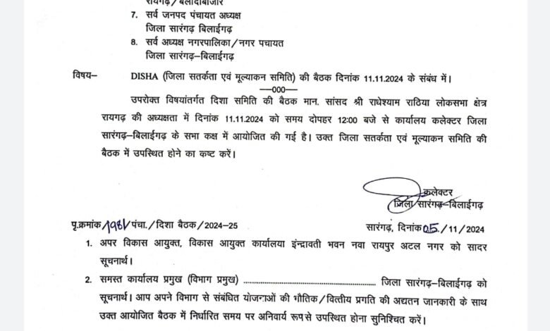 कलेक्ट्रेट सारंगढ़ में दिशा समिति की बैठक 11 नवंबर को होगी