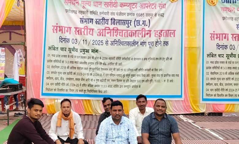 छत्तीसगढ़ सहकारी समिति कर्मचारी संघ एवं समर्थन मूल्य धान खरीदी कंप्यूटर ऑपरेटर संघ के प्रबंधकों और कंप्यूटर ऑपरेटरों ने अपनी लंबित चार सूत्रीय मांगों को लेकर 3 नवंबर 2025 से संभाग स्तरीय अनिश्चितकालीन हड़ताल शुरू कर दी है। प्रदेश अध्यक्ष के नेतृत्व में बिलासपुर सहित प्रदेशभर के प्रबंधक और ऑपरेटर धरना स्थल पर बैठकर सरकार के खिलाफ अपना विरोध दर्ज करा रहे हैं।