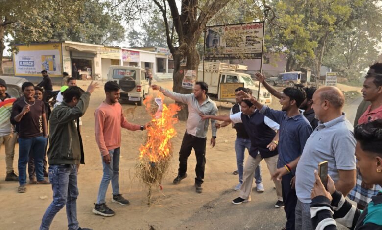 सारंगढ़ – प्रदेश मे भाजपा की सरकार बने दो साल पूरे हो चुके है लेकिन अभी तक सरकार के द्वारा पी.एस.सी की तैयारी कर रहे अभ्यर्थीयों के लिए पी.एस.सी कैलेंडर जारी नहीं किया गया है जिससे अभ्यर्थीयों तथा तैयारी कर रहे बच्चों मे काफी असमंजस की स्थिति उत्पन्न हो गई है जिसको ध्यान मे रखते हुए एन.एस.यू.आई विधानसभा अध्यक्ष अंकित पटेल के नेतृत्व मे एन.एस.यू.आई द्वारा कनकबीरा मे मुख्यमंत्री विष्णुदेव साय और वित्त मंत्री ओ.पी. चौधरी का पुतला दहन कर विरोध प्रदर्शन किया गया एवं पी.एस.सी. कैलेंडर जारी करने की मांग की गई।