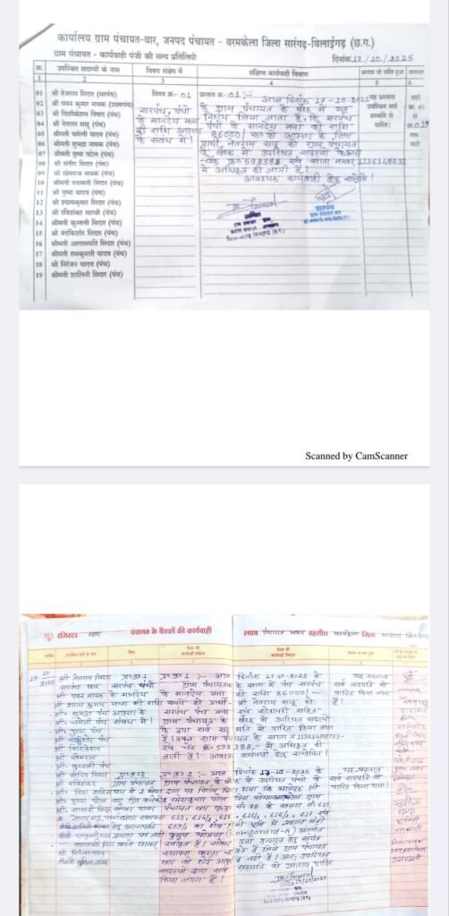 सारंगढ़–बिलाईगढ़ जिले के जनपद पंचायत बरमकेला अंतर्गत ग्राम पंचायत बार में पंचायत सचिव दौलत राम जायसवाल का एक और कथित कारनामा सामने आया है। पंचायत में प्रस्ताव पंजी के दुरुपयोग को लेकर ग्रामीण पंचों में नाराजगी देखी जा रही है। आरोप है कि सचिव द्वारा नियमों को ताक पर रखकर बिना पंचों की जानकारी और मौजूदगी के महत्वपूर्ण प्रस्ताव पारित कर दिए गए।