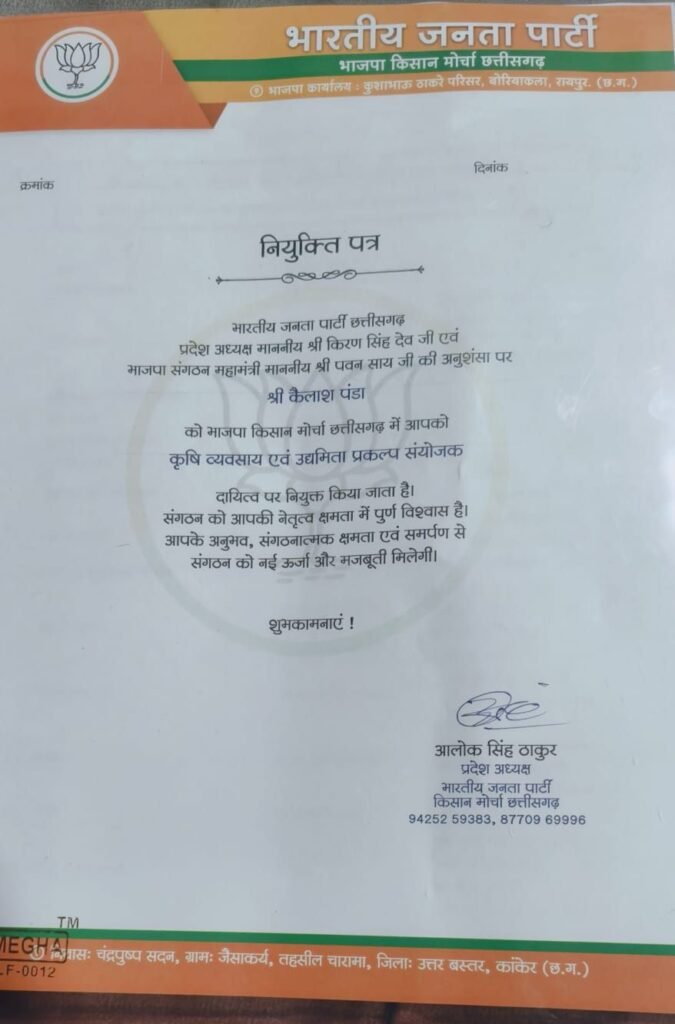 भाजपा कार्यालय में प्रदेश अध्यक्ष आलोक सिंह ठाकुर ने कैलाश पण्डा को नियुक्ति पत्र देकर किया सम्मानित