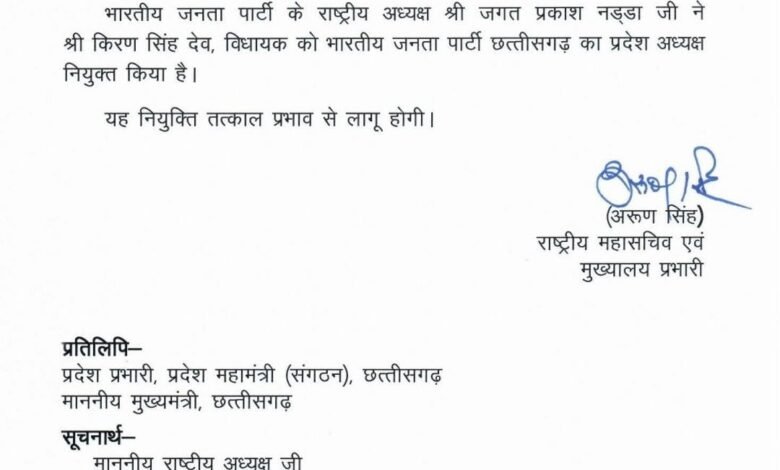 राष्ट्रीय महामंत्री अरुण सिंह ने जारी किया आदेश…