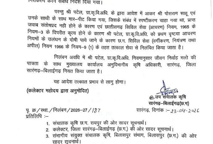 सारंगढ़ / सारंगढ़-बिलाईगढ़ जिले में पत्रकार पोश राम साहू के साथ मारपीट करने वाले कृषि विभाग के अधिकारी पर आखिरकार प्रशासन का डंडा चल गया है। लंबे समय से चर्चा में रहे इस मामले में अब बड़ी कार्रवाई सामने आई है। बताया जा रहा है कि जिला कलेक्टर संजय कन्नौजे ने पूरे मामले को गंभीरता से लेते हुए तत्काल संज्ञान लिया और जांच के बाद दोषी पाए गए अधिकारी पर कड़ी कार्रवाई के निर्देश दिए। कलेक्टर के निर्देश पर उप संचालक कृषि विभाग (DDA) ने प्रवीण पटेल, ग्रामीण कृषि विस्तार अधिकारी (REO) को निलंबित कर दिया है।