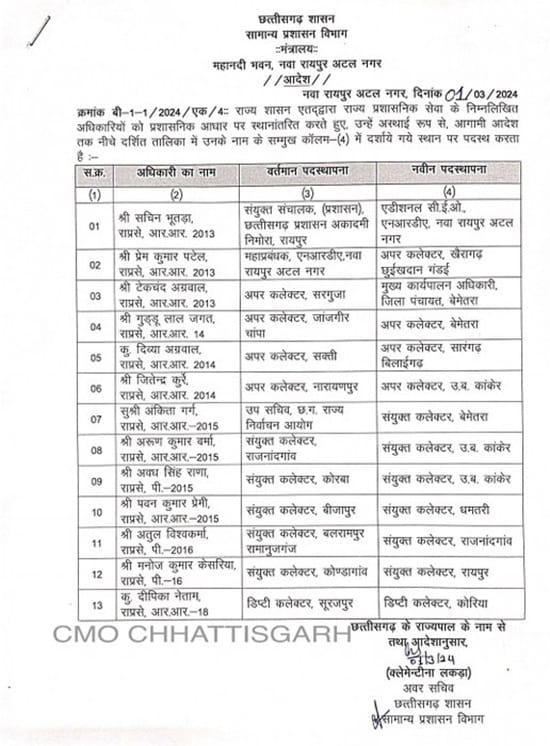 सामान्य प्रशासन विभाग ने 13 अधिकारियों का ट्रांसफर किया है। जारी आदेश के अनुसार, प्रदेश के कई जिलों से संयुक्त संचालक, महाप्रबंधक अपर और संयुक्त कलेक्टर स्तर के अधिकारियों का फेरबदल किया गया है।