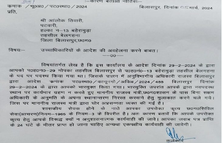 राजस्व मंत्री की नाराजगी के बाद कलेक्टर ने पटवारी को जारी किया नोटिस।