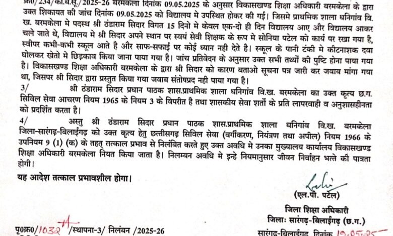 सारंगढ़ बिलाईगढ़ (छ.ग.) — सुशासन तिहार के दौरान ग्रामवासियों द्वारा की गई शिकायत के बाद शासकीय प्राथमिक शाला धनीगांव के प्रधान पाठक श्री ठंडा राम सिदार को तत्काल प्रभाव से निलंबित कर दिया गया है। ग्रामीणों ने आवेदन के माध्यम से आरोप लगाया था कि सिदार शासकीय कार्यों में लापरवाही बरतते हैं, समय पर विद्यालय नहीं आते और अपने कर्तव्यों का सही ढंग से निर्वहन नहीं कर रहे हैं।