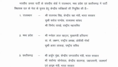 भाजपा ने तीन राज्यों में सीएम के चयन को लेकर केंद्रीय पर्यवेक्षकों की नियुक्ति कीछत्तीसगढ़ में तीन पर्यवेक्षकों को विधायक दल का नेता चुनने दी जिम्मेदारी केंद्रीय मंत्री अर्जुन मुंडा , सर्वानंद सोनोवाल और…